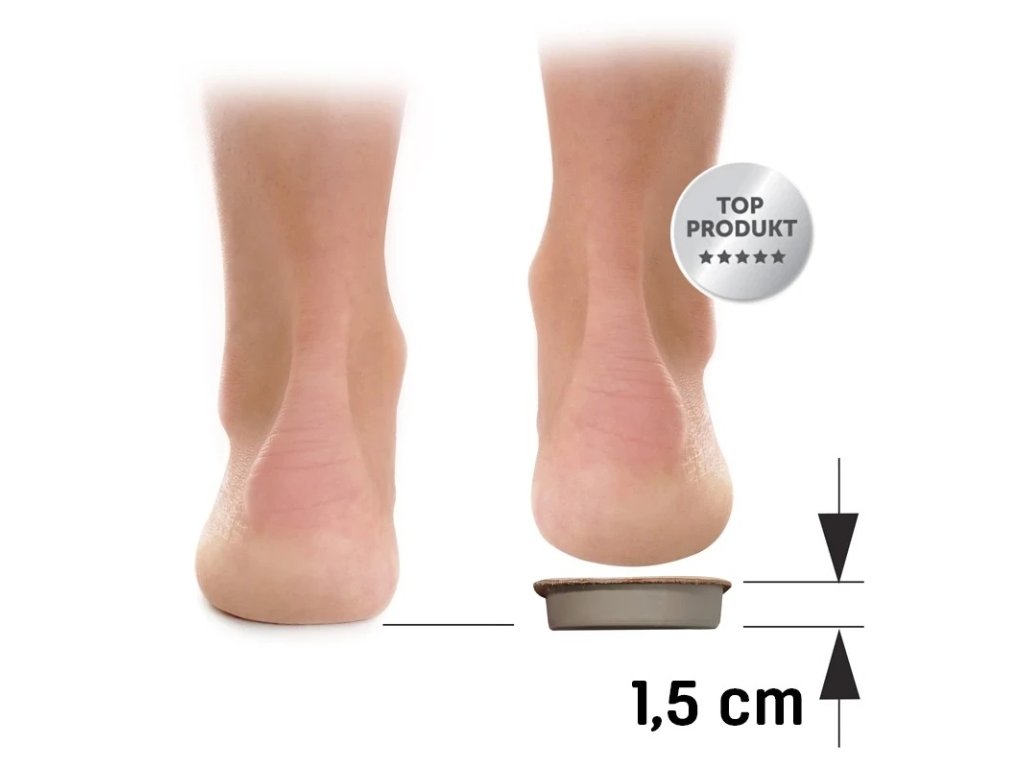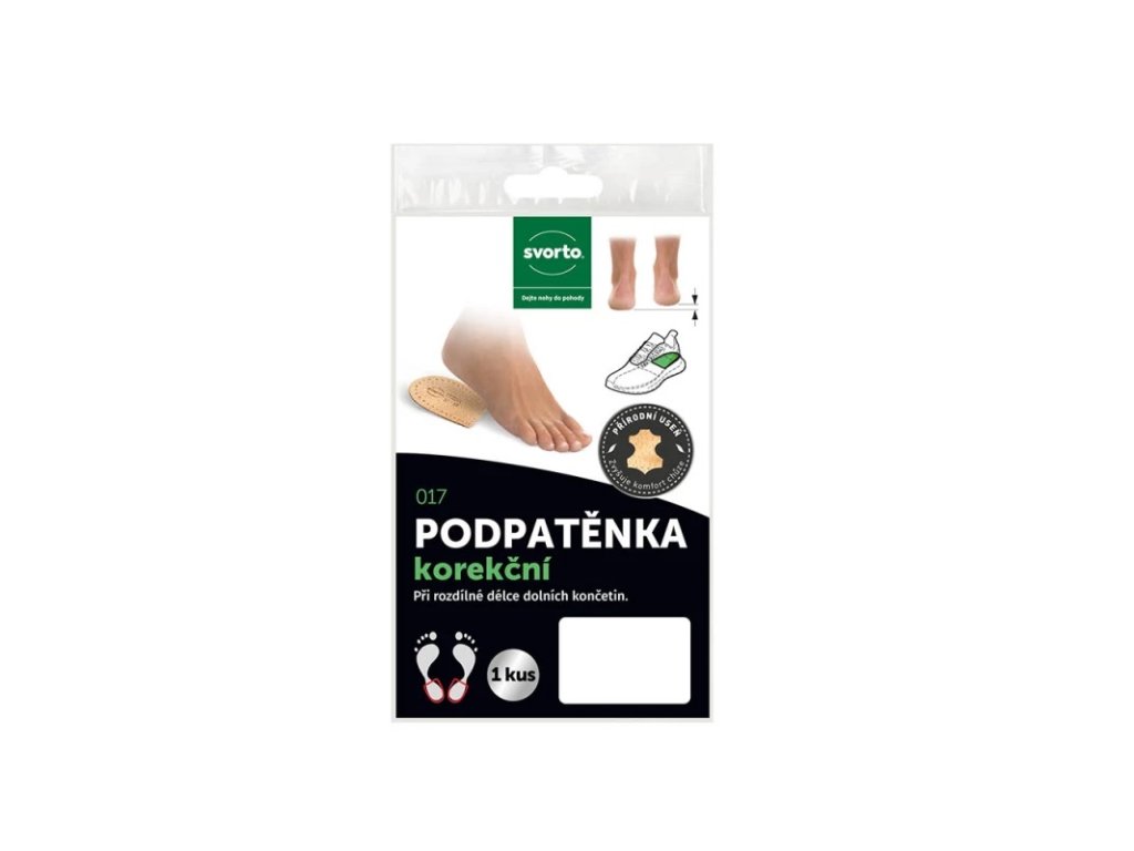 Podpatěnka je určena k vyrovnání rozdílu výšky dolních končetin, ke zmírnění zátěže paty nebo prodloužení achilovky. Vyrobena z lehkého, pohodlného a tvarově stálého PU materiálu pro zajištění stability, s vrchní nášlapnou částí potaženou jehněčí usní; lze ji snadno připevnit do obuvi přiloženými samolepicími kolečky, Výška 1,5 cm, přičemž je doporučeno použití v obuvi s maximálním výškovým rozdílem paty do 2 cm.Doplňkové parametry