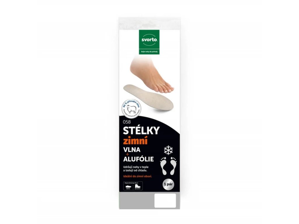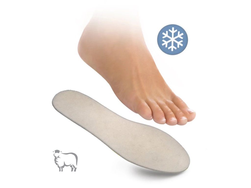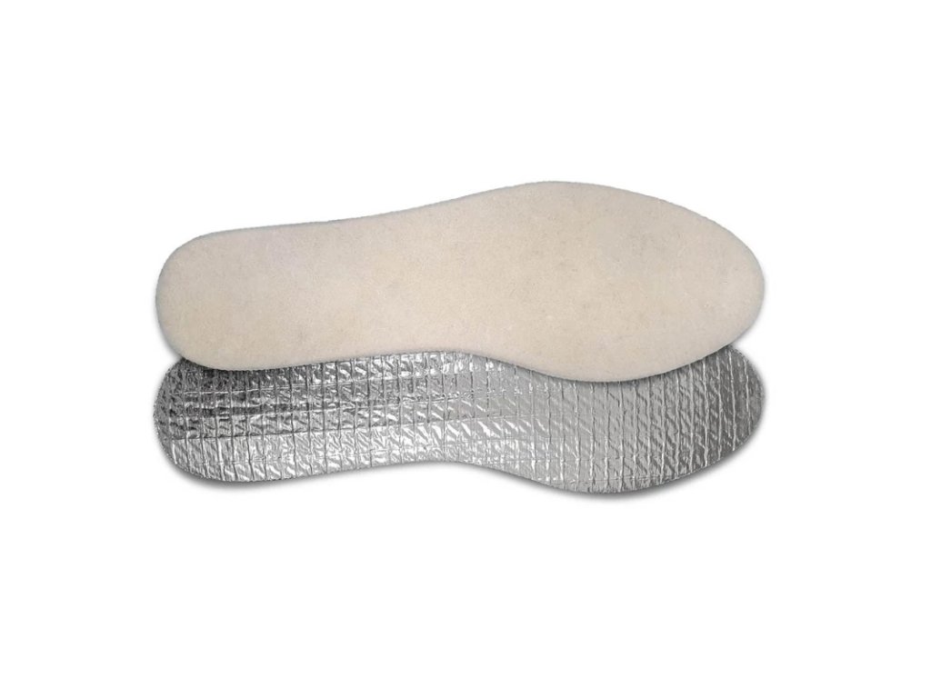 Teplé vkládací ploché vložky ideální do zimní obuvi, speciálně navrženy pro izolaci od chladu - tvořeny třemi vrstvami: horní vrstvou z přírodní vlny (95 %) pro tepelný komfort, středovou vrstvou z polyethylenu pro izolaci proti vlhkosti a spodní hliníkovou fólií pro izolaci od chladu, která je navíc opatřena protiskluzovou úpravou. Velikost lze upravit zastřižením.Doplňkové parametry