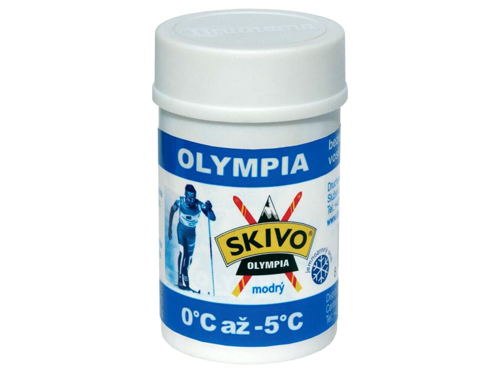 Skivo OLYMPIA modrý je běžecký stoupací tuhý vosk (grip) určený pro rekreační lyžaře. Tento vosk se používá pro dobrý odraz a stoupání běžeckých lyží na jemnozrnném a prachovém sněhu. Jeho teplotní rozsah použití je 0 °C až -5 °C. Balení má hmotnost 40 g.Doplňkové parametry