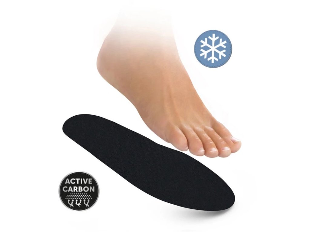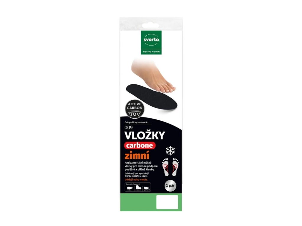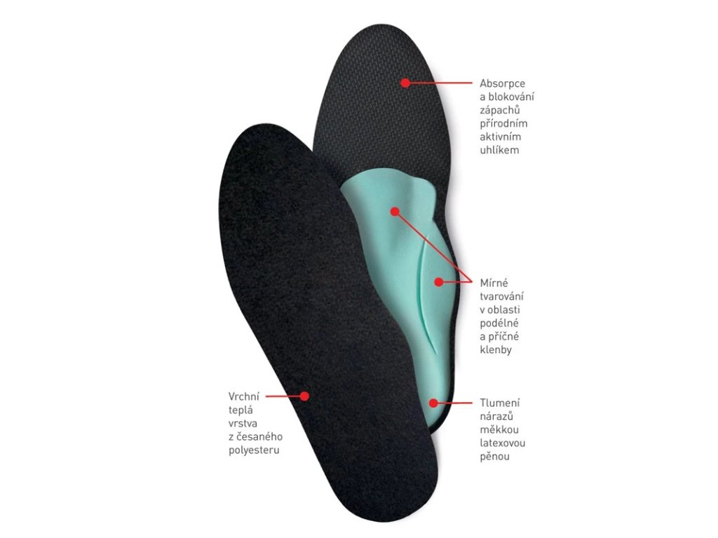 Antibakteriální měkké, ortopedicky tvarované vložky určené pro použití v zimní obuvi, které poskytují mírnou podporu podélné a příčné klenby; vložky efektivně sají pot a potlačují zápach díky latexové stélce s aktivním uhlíkem, mají vrchní teplou vrstvu ze 100% česaného polyesteru pro tepelný komfort, zajišťují tlumení nárazů a lze je upravit zastřižením pro přesné padnutí do boty.Doplňkové parametry