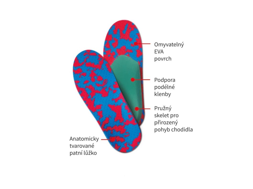 Lehké a měkké ortopedicky tvarované vložky s pevným polypropylenovým skeletem, které jsou navrženy pro podporu podélné klenby a zajišťují správné osové postavení chodidla, čímž pomáhají stabilizovat celý postoj a předcházet problémům s klouby a zády; vložky mají omyvatelný a měkký povrch z perforovaného materiálu EVA, mírně anatomicky tvarované patní lůžko, díky svému tenkému provedení minimálně zmenšují vnitřní prostor obuvi.Doplňkové parametry