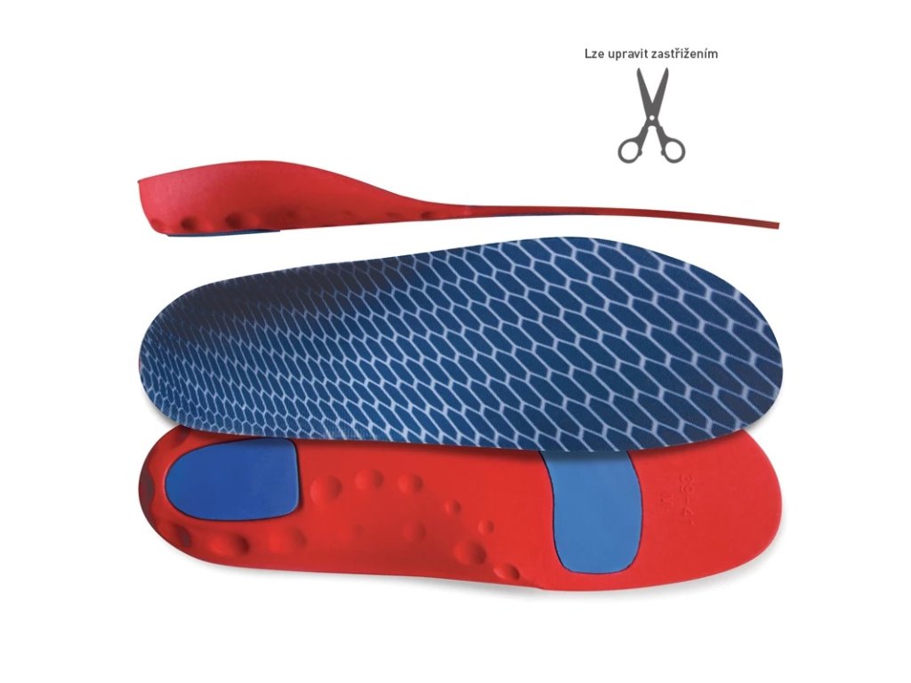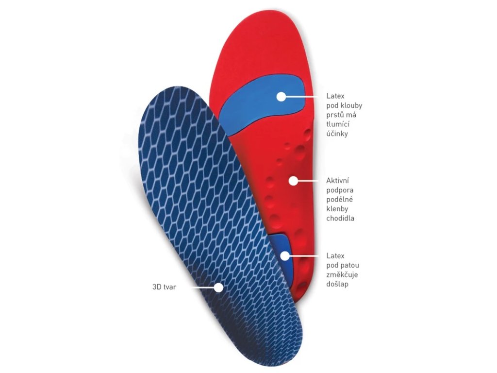 Ortopedicky tvarované sportovní vložky s pevnější a tužší podporou podélné klenby, které jsou navrženy pro větší zátěž a sportovní aktivity; vložky jsou vyrobeny z odolného EVA materiálu, mají zvýšený okraj pro stabilizaci patního lůžka a pro zajištění komfortu a ochrany citlivých částí nohy obsahují antišokový materiál pod patou a klouby prstů, který tlumí nárazy a změkčuje došlap, čímž zlepšují stabilitu a preventivně působí proti únavě a vzniku deformit.Doplňkové parametry