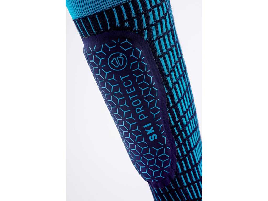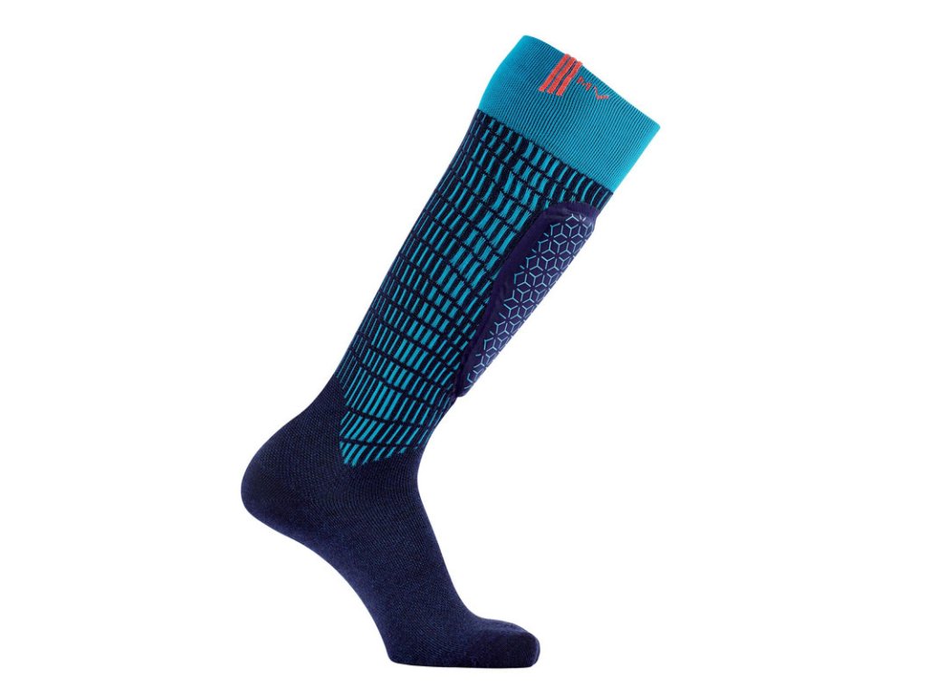 Zateplené lyžařské ponožky z vlny Merino s integrovaným chráničem holeně představují unikátní řešení pro lyžaře trpící bolestí holeně, neboť chránič rozkládá tlak a absorbuje nárazy.